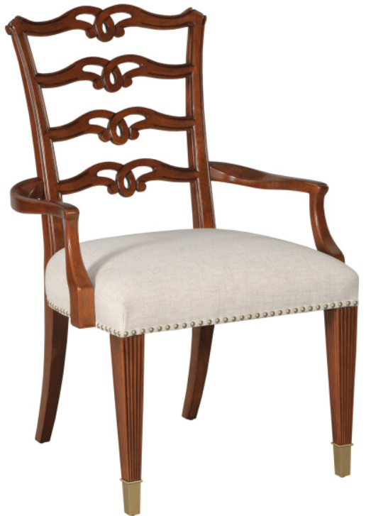 The American Drew® Addison Bartley Beige/Brown Arm Chair offers a comfortable upholstered seat in beige with brown accents. The sturdy frame and armrests provide additional support, making it a practical and stylish choice for dining rooms or living areas. Its timeless appeal enhances any space while ensuring durability.Read More