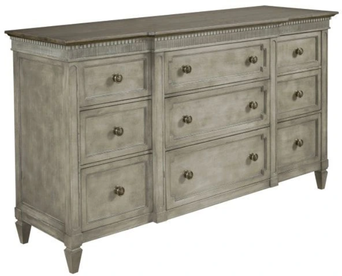 Breakfront nine drawer dresser has cedar lined bottom drawers, jewelry insert in top drawer and finished off with a mocha elm finish top. Details include framed drawer fronts, dentil moulding and reeding on the top of case.Read More