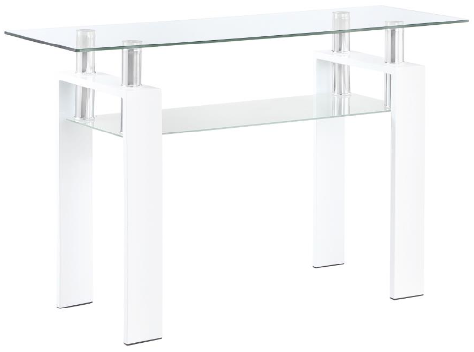 Add the combination of style and function with this eye-catching sofa table from the Dyer Collection. Shown in glass top and white finish. Make a bold statement by incorporating this stunning table into your home.Read More