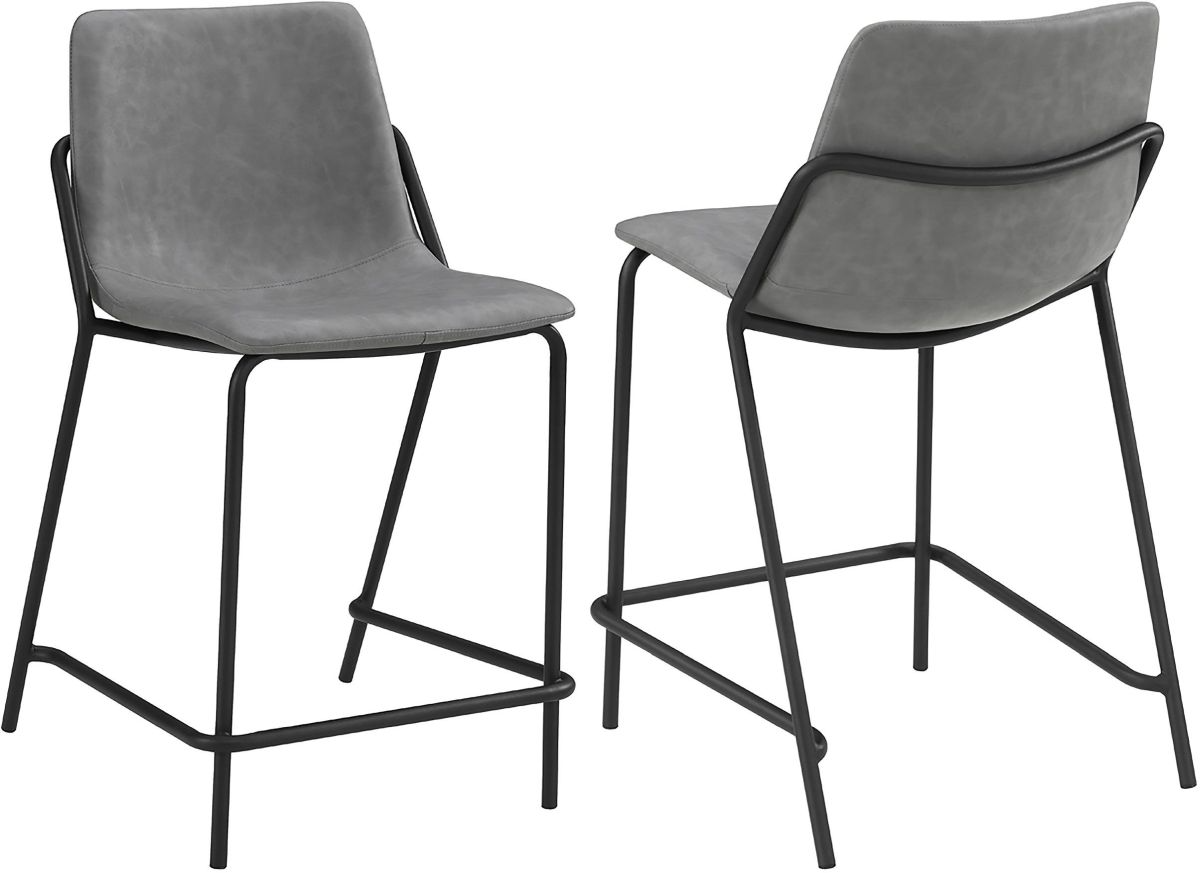 This pair of two stools offer a minimal look and a contemporary vibe. Supported by thin and tall frame in a black finish, it has an open and airy design that works with many styles. Each chair has a bucket style, Mid Century inspired seat, which is wrapped in a leatherette that is easy to clean and soft to the touch. In addition, each stool offers a supportive footrest run between the two front legs. Add a pair of these stools to a home bar for entertaining.