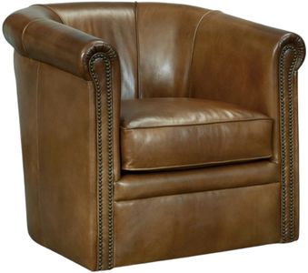 Timeless and traditional, the Axton Swivel leather club chair has a barrel-style silhouette with rolled arms and vertical channeling. Upholstered in the aniline top grain checkmate pawn hand-wiped leather, it is trimmed in antique brass nailheads.Read More