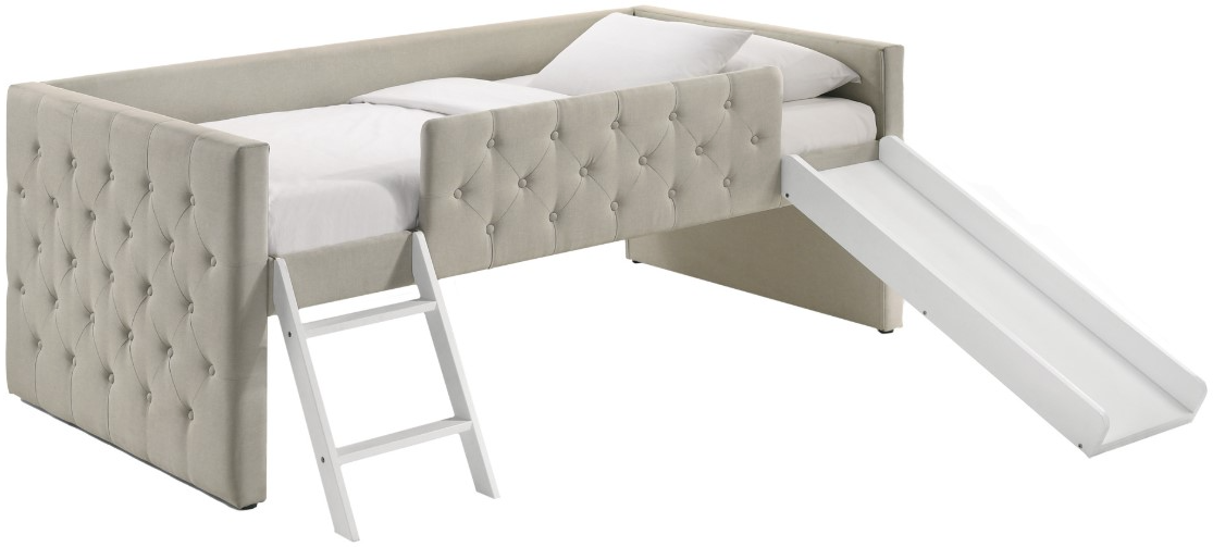 The Intercon Addyson fog youth twin upholstered loft bed features a soft, fog-colored fabric upholstery with a cushioned headboard for added comfort. This twin-sized bed offers a sturdy frame, perfect for a child's room. Its neutral, versatile design easily complements various decor styles, making it both a stylish and practical choice.Read More